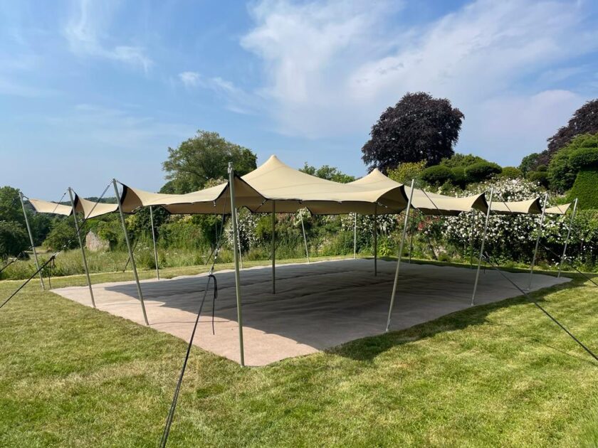 Couples ask us for something that doesn’t look and feel like a traditional marquee but can provide cover from sun and rain. We have been searching for the right solution for this for some time and feel the stretch marquee fulfils this perfectly. With the sides on their higher setting the structure seems to float above the ground, it has the lightest touch and warmest feel of any marquee available.